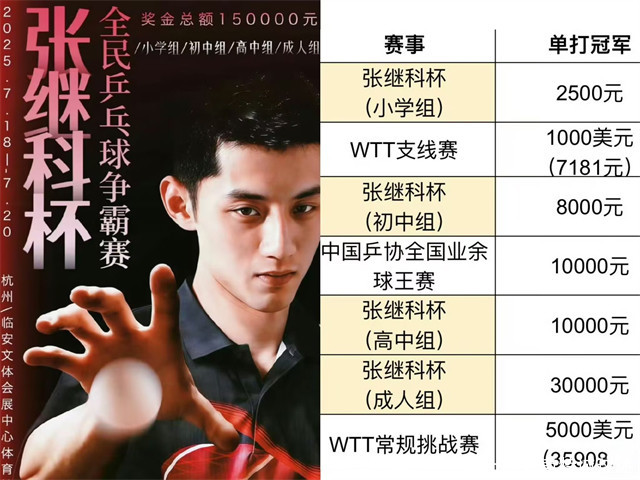 另外,把柄网上音书,由张继科发起的“张继科杯”的比赛设四组别,共15万奖金,其中成东谈主组冠军3万奖金是WTT支线赛的四倍!由此可见,WTT营业联赛利益分拨显着不对理,以至连国内草根全民赛事的奖金水平王人够不上,更别说那些需要私费去宇宙投入WTT赛事的畅通员有何等艰苦了!